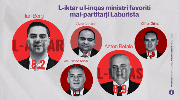 L-inqas popolari mal-Laburisti huma l-Ministri Anton Refalo (6.9), Roderick Galdes (7.35) u Jonathan Attard (7.41).